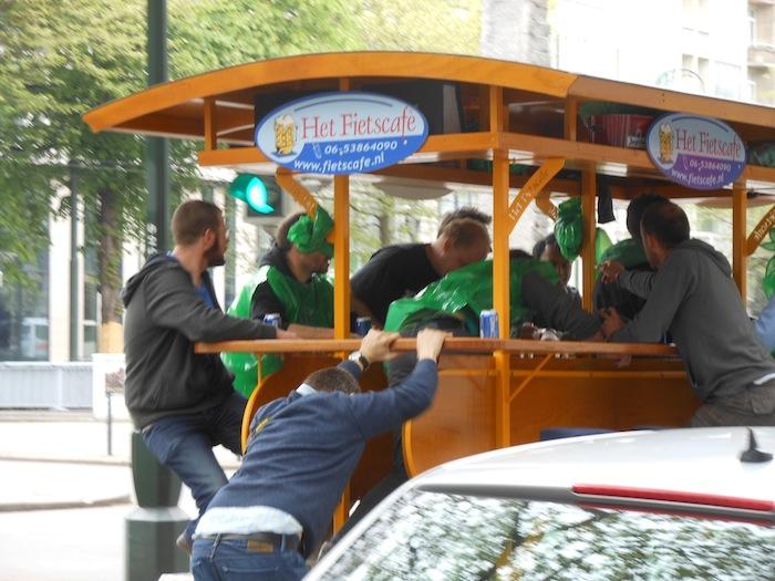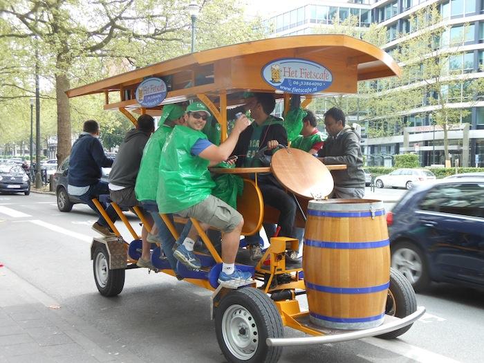 先日アベニュールイーズを散歩していると、突然面白い乗り物が現れた。筋肉隆々の逞しい男たちが楽しそうにビールを飲みながら、自転車を一緒に漕いで走っている。