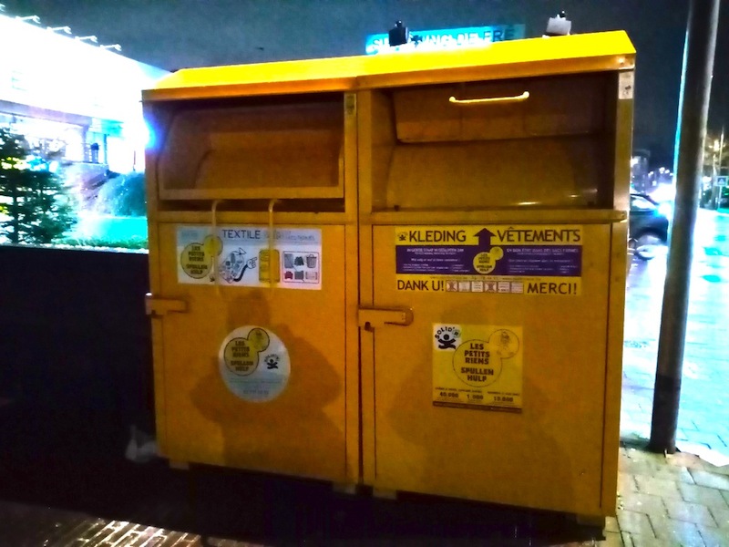 洋服(蘭:KLEDING/仏:VÊTEMENTS)と書かれた黄色いコンテナーは、「まだ着ることができる洋服」を、慈善活動の団体に寄付するものです。