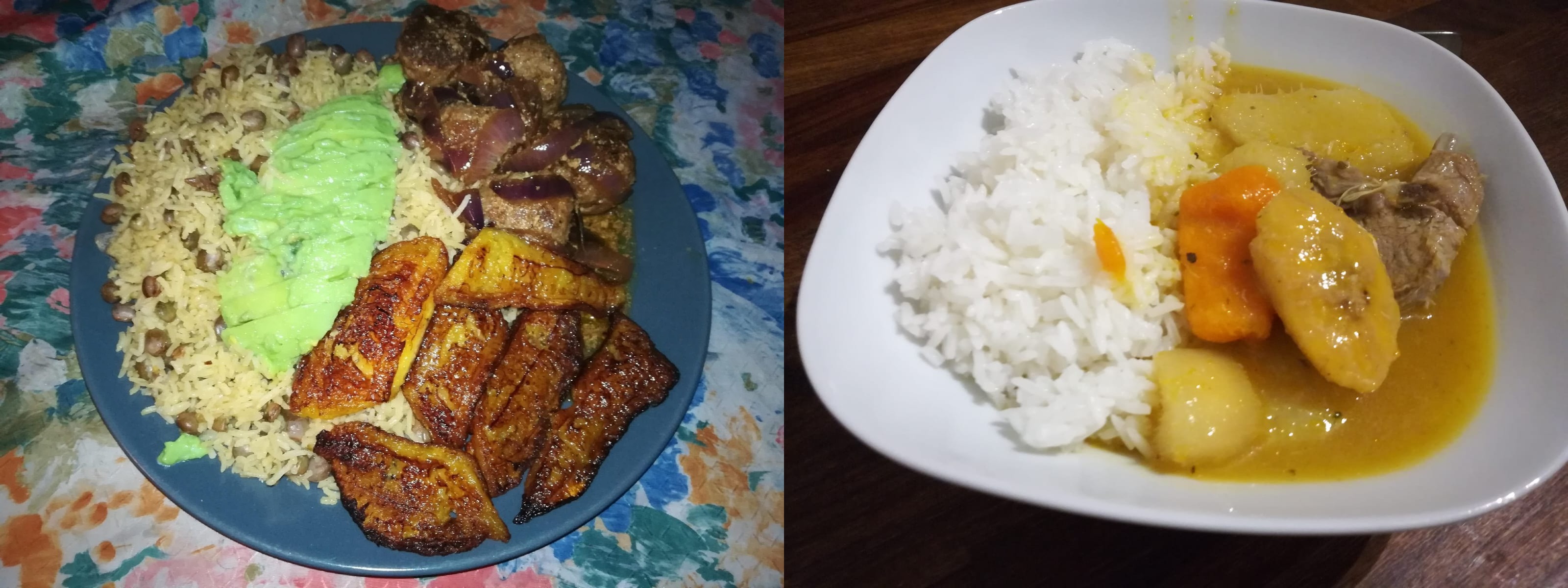 母の作った料理が一番好きです。豆入りのご飯、アボカド、揚げたプランテン添え鶏もも肉です。