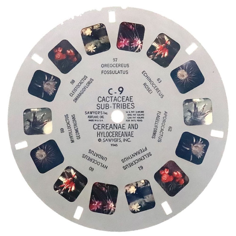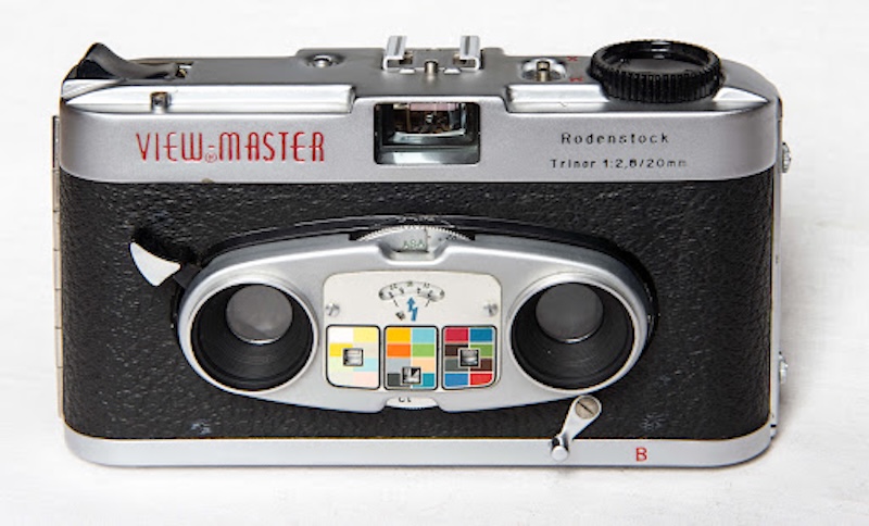 これは人間の目と同じ間隔で2枚の写真を同時に撮影するカメラで、それぞれ左目用と右目用に分けて円形のカードに配置し、専用の双眼鏡のような装置にセットすると、脳が左右の画像を統合して立体的に(3Dで)見えるという仕組みです。